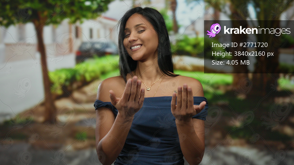 Young woman gesturing come in a sunny park, smiling confidently with trees and city street in the background, conveying warmth and invitation in an outdoor urban setting. - Kraken Images