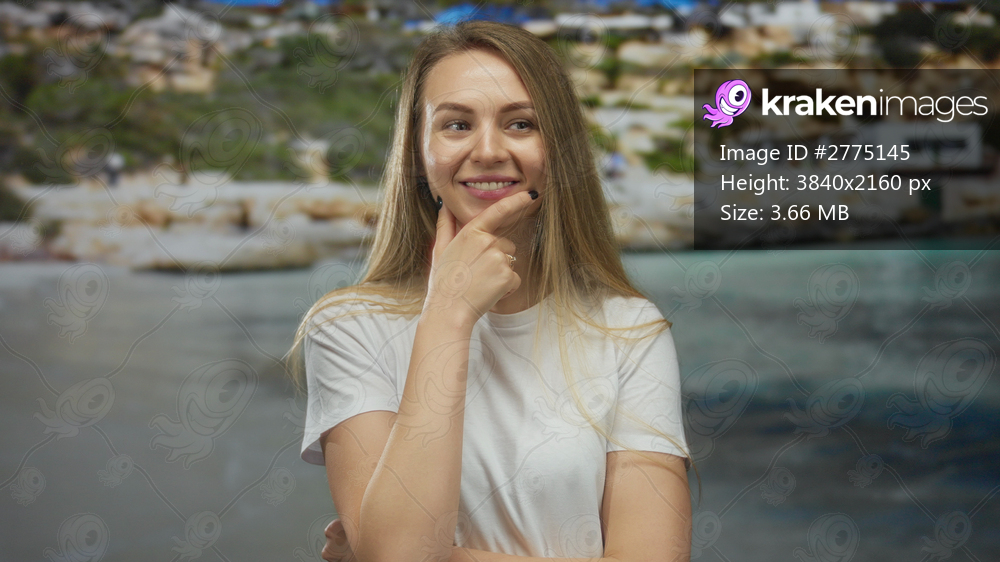 Young woman gesturing happily at a scenic beach location with blurred seaside view in the background showcasing her relaxed outdoor enjoyment and positivity. - Kraken Images