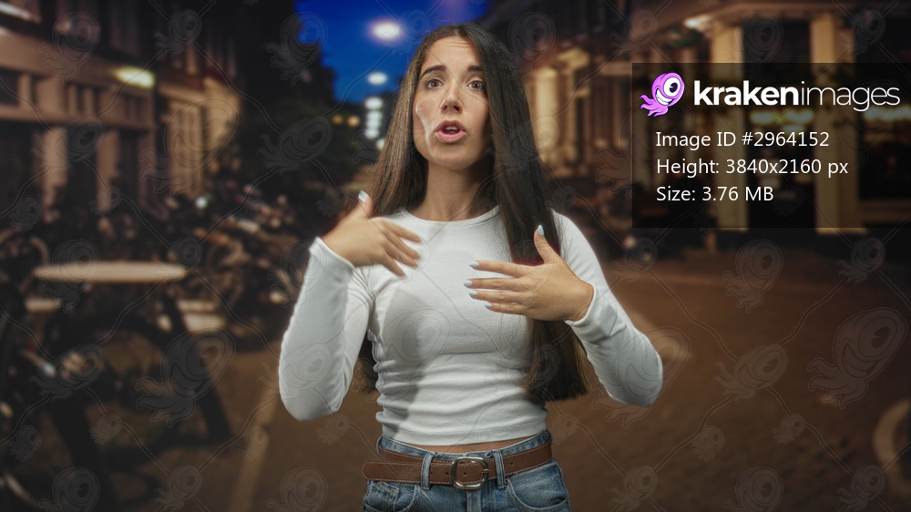 Young woman gesturing with open hands on a city street at night, wearing white top and jeans with long hair, facing camera; concern.