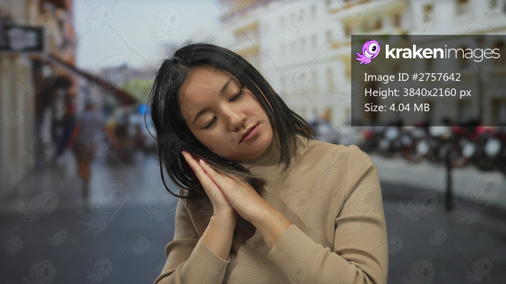Young woman gesturing sleep on busy city street in daylight with buildings and people blurred in background capturing urban life vibe