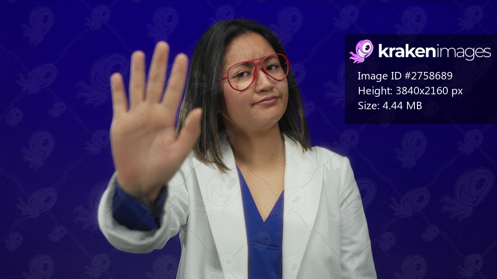 Young woman gesturing stop with hand in front of face on a blue isolated background wearing a white blazer and red glasses showcasing a confident stance. - Kraken Images