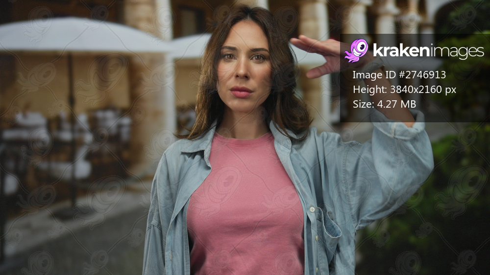 Young woman giving a military salute in a casual denim jacket stands on a restaurant terrace with street view and outdoor ambiance in a vibrant city setting. - Kraken Images
