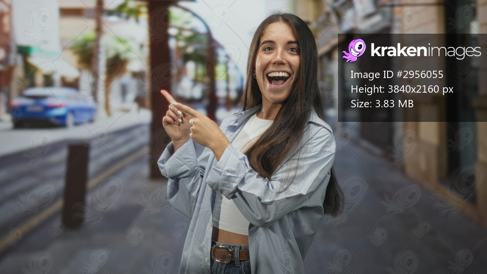 Young woman giving thumbs up and smiling while standing on a narrow city street with storefronts, bollards and a parked car visible; joy optimism.