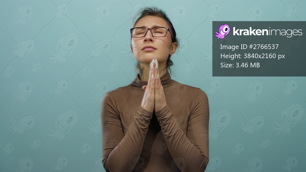 Young woman with glasses and a brown top praying with clasped hands against an isolated blue background wall