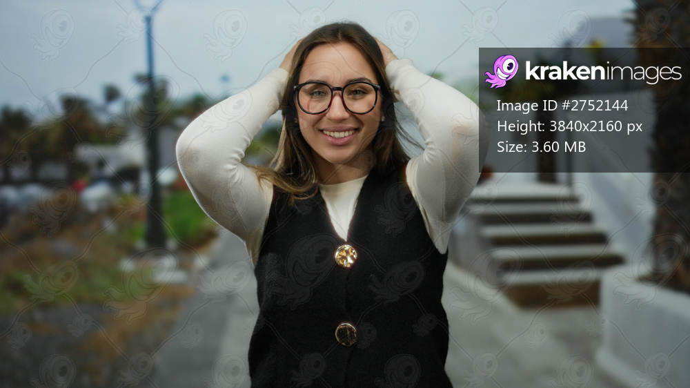 Young woman with glasses and blonde hair smiling joyfully outdoors on a city street, surrounded by urban architecture, capturing a lively and carefree moment. - Kraken Images