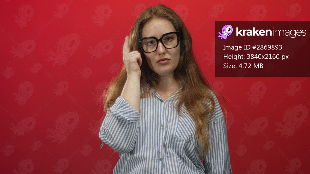 Young woman with glasses finger to temple and finger pointing to camera in red studio and serious expression; confidence.