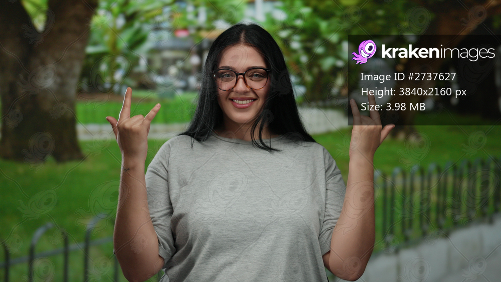 Young woman with glasses gesturing rock sign in a sunny park setting smiling confidently.