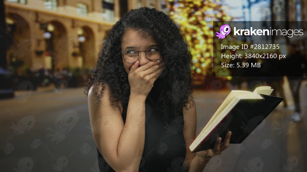 Young woman with glasses holding book on street with lights smiling with hand on mouth during evening