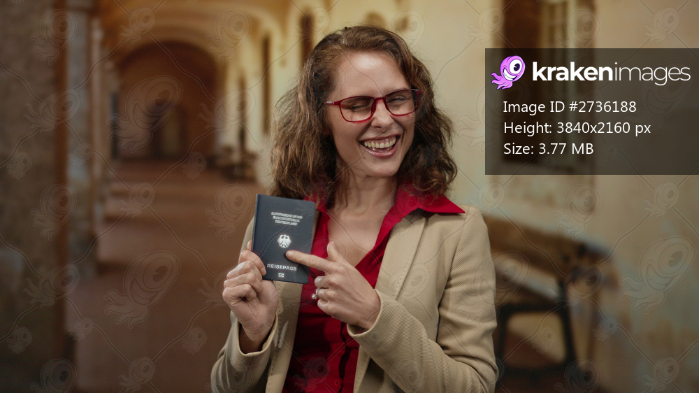Young woman with glasses holding german passport smiling in an old university hallway indoor, showcasing excitement for travel and identification.