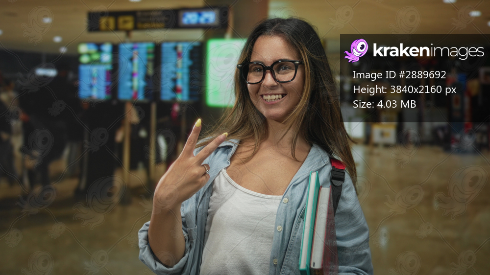 Young woman with glasses holding notebooks and flashing peace sign in crowded airport terminal; student travel confidence.