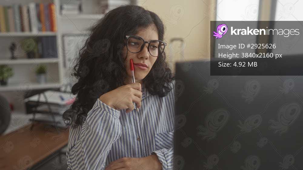 Young woman with glasses holding pen to chin while looking at monitor in building; concentration planning study.