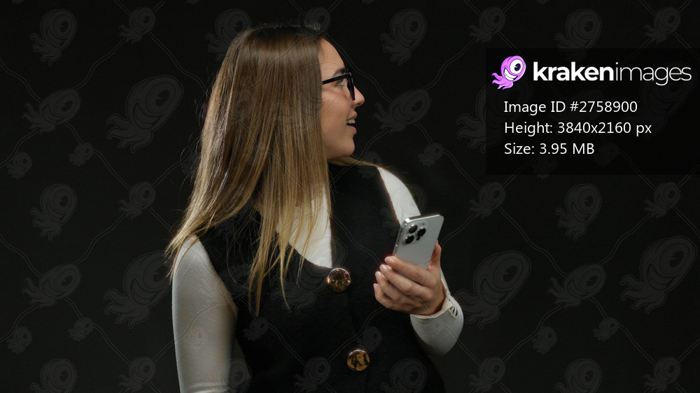 Young woman with glasses holding smartphone against dimly lit black background with a confident smile.