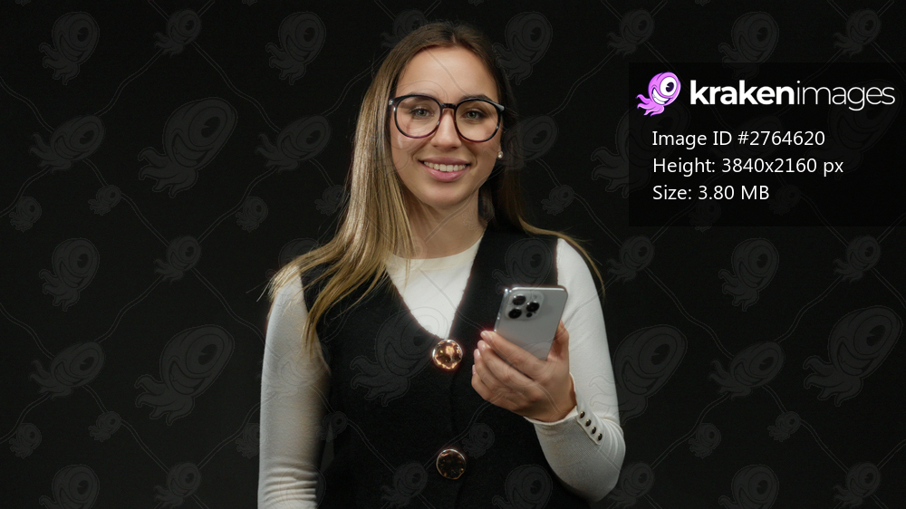 Young woman with glasses holding smartphone against dimly lit black background with a confident smile.