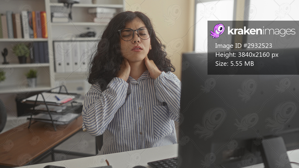Young woman with glasses holds neck with both hands at office desk beside a computer monitor, wincing from neck pain; work stress.