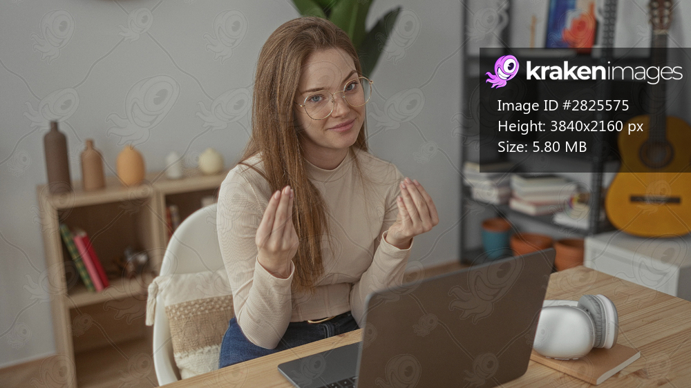 Young woman with glasses pinches fingers over laptop at wooden desk in office building; serenity focus.