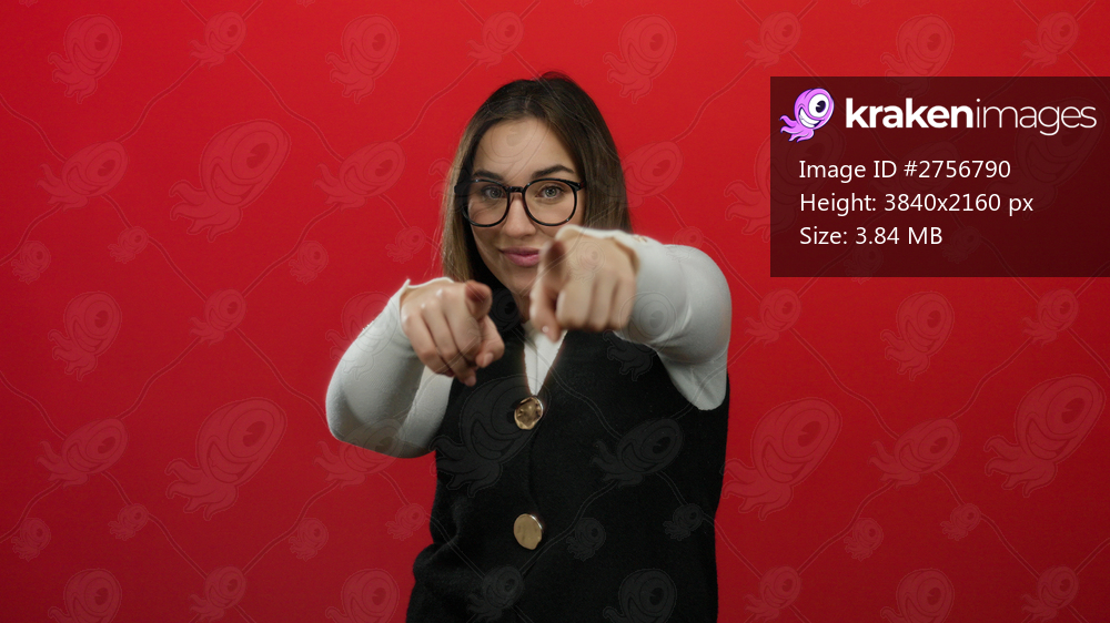 Young woman with glasses pointing and posing over isolated red background showcasing playful and confident expression.