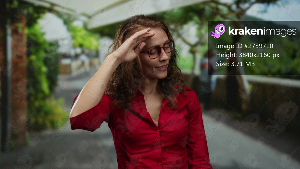 Young woman with glasses saluting in a park setting while wearing a red shirt and smiling joyfully outdoors with greenery and walkway as backdrop during daylight. - Kraken Images