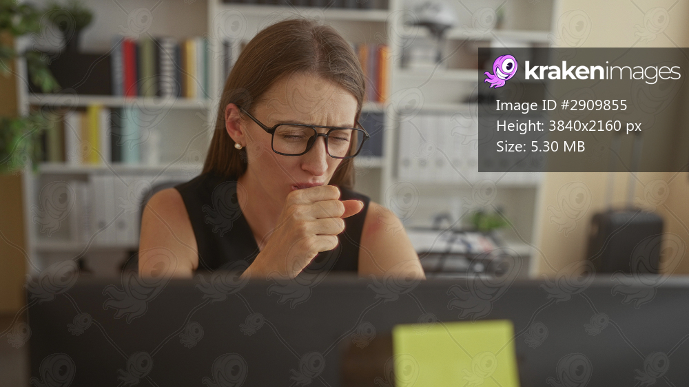 Young woman with glasses seated at office desk coughing with hand on throat in building, looking uncomfortable; illness concern.