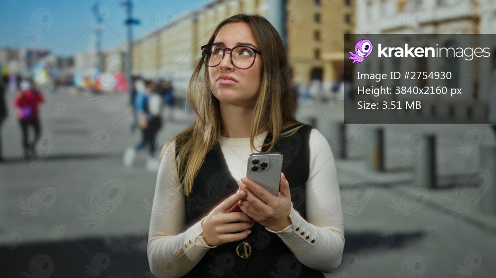 Young woman with glasses and smartphone on a bustling street looks thoughtful while standing outdoors in an urban area filled with people and historic architecture. - Kraken Images