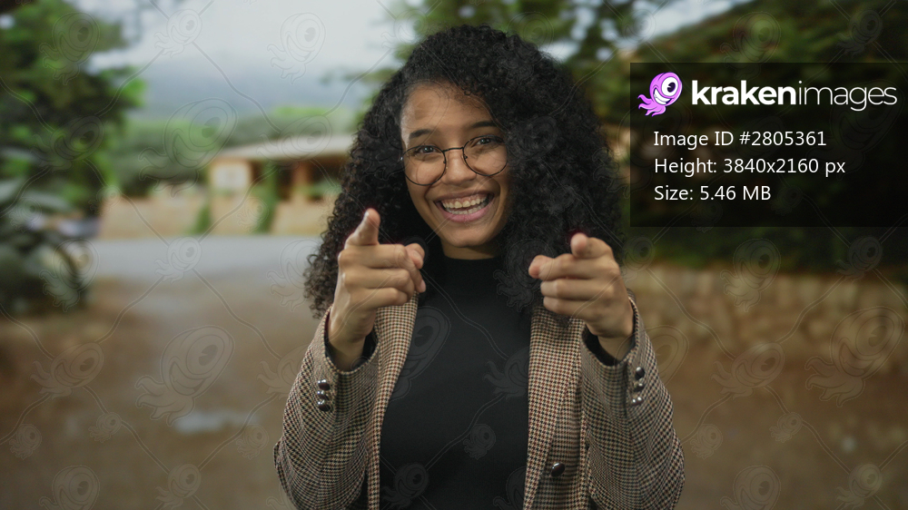 Young woman with glasses smiling on an old town street, exuding confidence and charm in an outdoor setting.