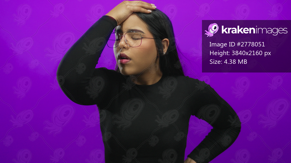 Young woman with glasses standing against vibrant purple wall expressing various emotions in isolated setting, showcasing herpan style and thoughtful demeanor. - Kraken Images