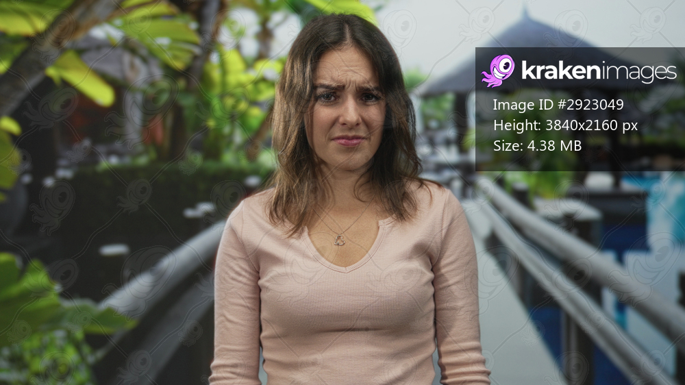 Young woman grimacing with scrunched face and closed eyes on a resort pool walkway near a cabana; disgust travel mishap.