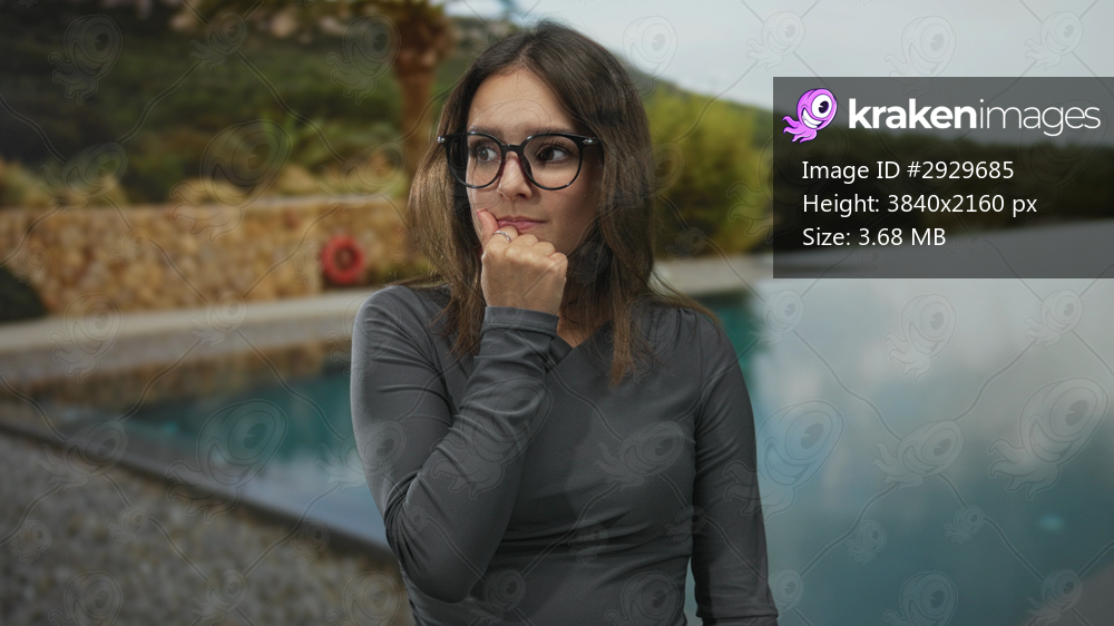 Young woman with hand covering mouth and black glasses at outdoor poolside stone wall wearing long sleeve top; surprise reflection.