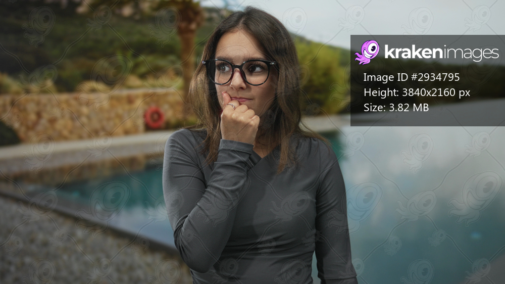 Young woman with hand covering mouth and black glasses at outdoor poolside stone wall wearing long sleeve top; surprise reflection.