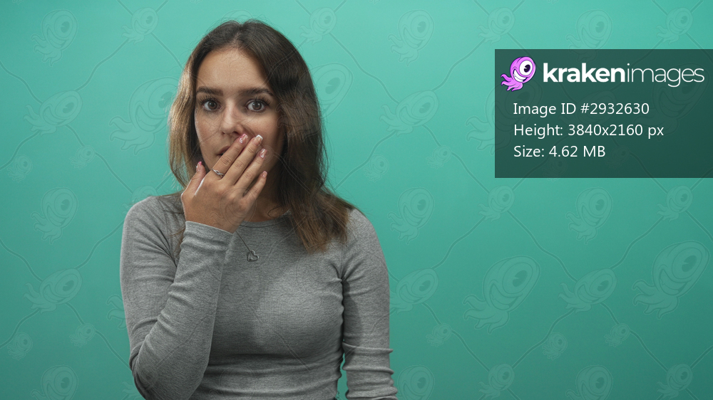 Young woman with hand covering mouth in a turquoise studio wearing grey long sleeve shirt and heart necklace; surprise.