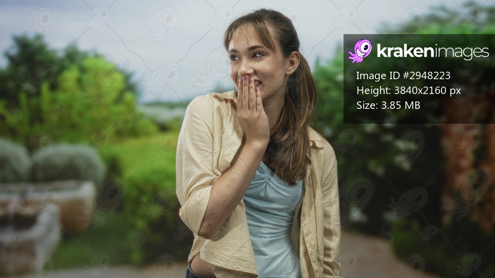 Young woman with hand covering mouth standing on a forest path near green shrubs wearing light blue top and beige open shirt, hair in ponytail; surprise. - Kraken Images