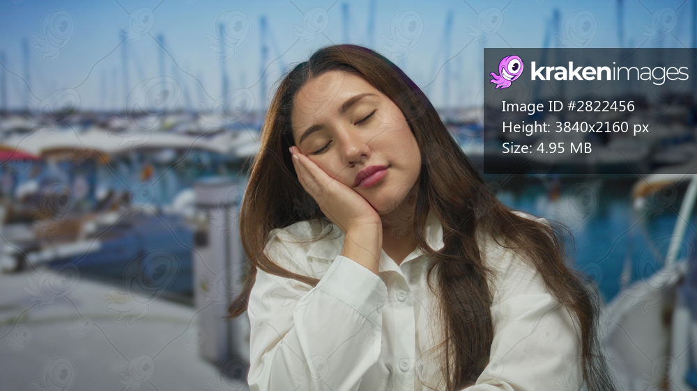 Young woman with hand on cheek for toothache beside boats at sunny port marina on seaside dock; discomfort.