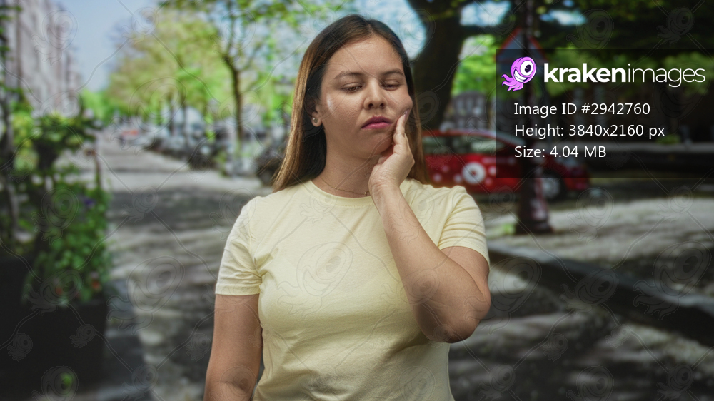 Young woman with hand on cheek for toothache on city street near parked car and tree lined sidewalk; discomfort.