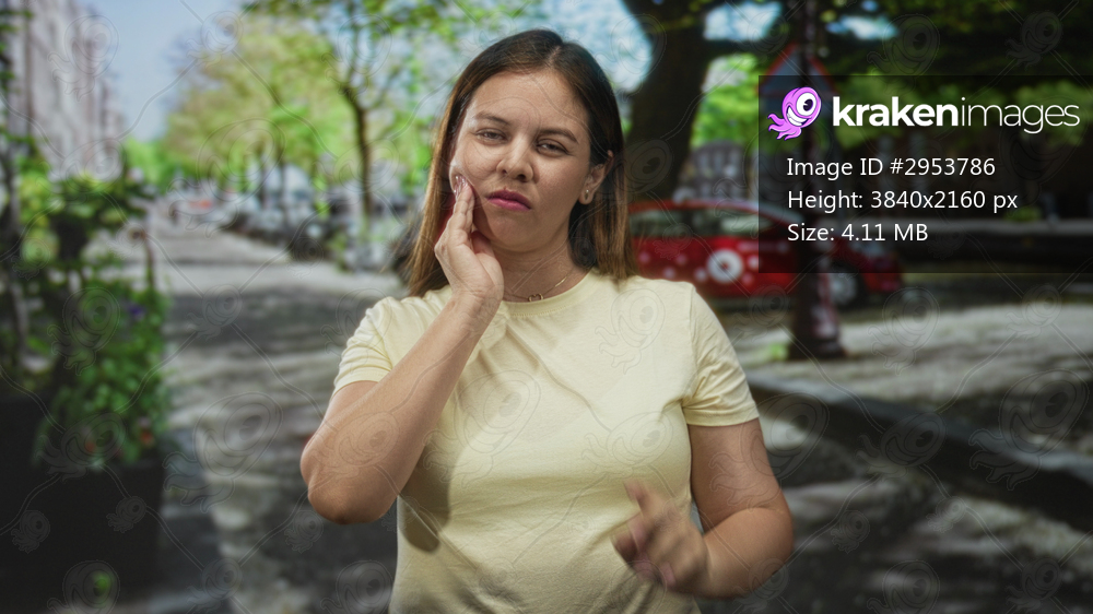 Young woman with hand on cheek for toothache on city street near parked car and tree lined sidewalk; discomfort.