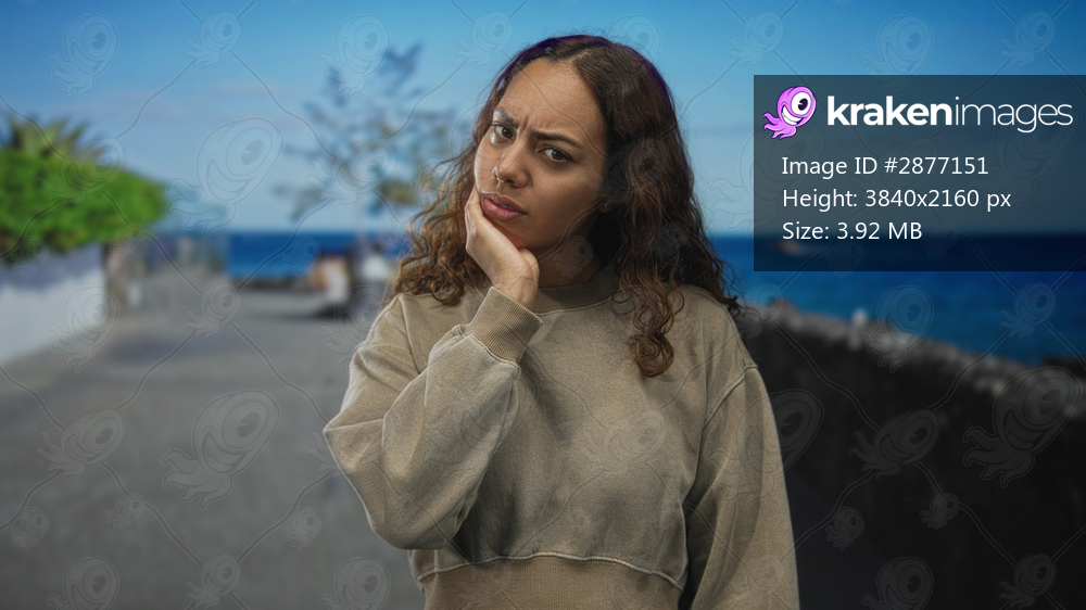 Young woman with hand on cheek and furrowed brow on seaside promenade by ocean walkway; toothache discomfort.