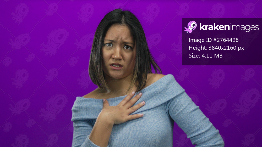 Young woman with hand on chest appears surprised while standing against a vibrant purple background, wearing a light blue sweater, conveying a sense of disbelief and emotion - Kraken Images