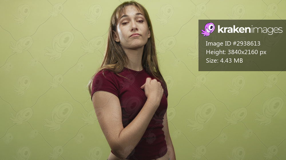 Young woman with hand on chest in green studio wearing maroon tshirt standing center; sincerity gratitude.