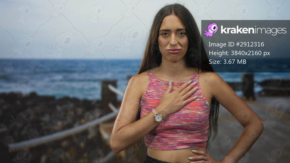 Young woman with hand on chest wearing watch and colorful knit top on street by the seaside pier; gratitude reflection.