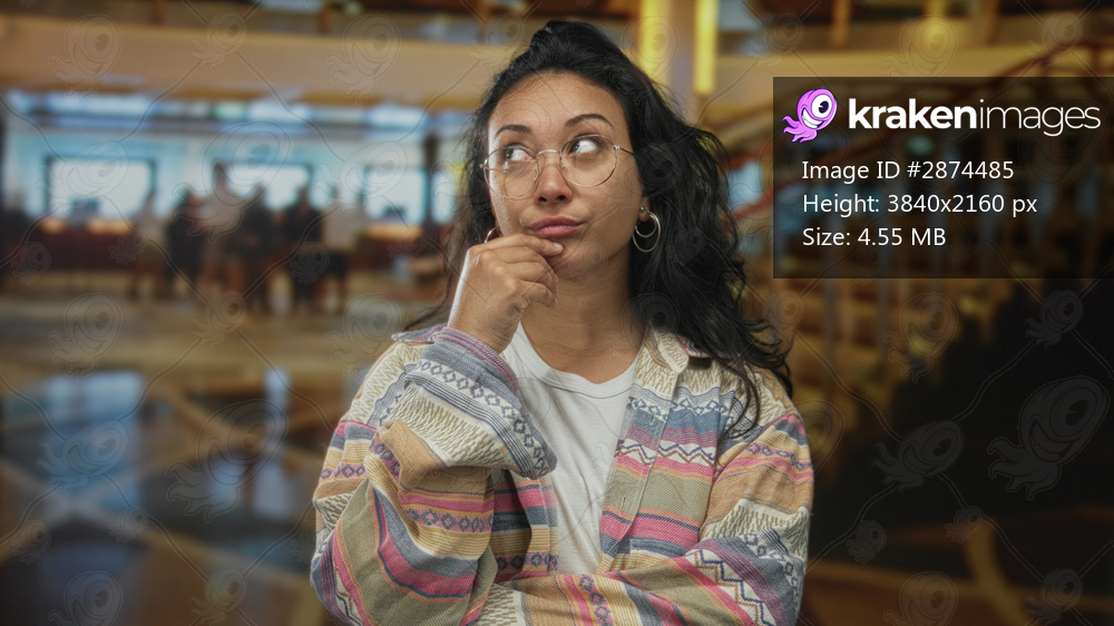 Young woman with hand on chin and folded arms wearing patterned cardigan and glasses in building lobby; playful curiosity.