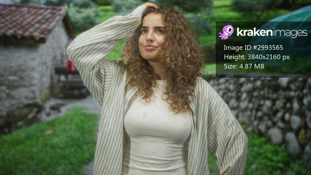 Young woman with hand on head and exposed chest standing by stone wall and greenhouse in a garden; thoughtful reflection.