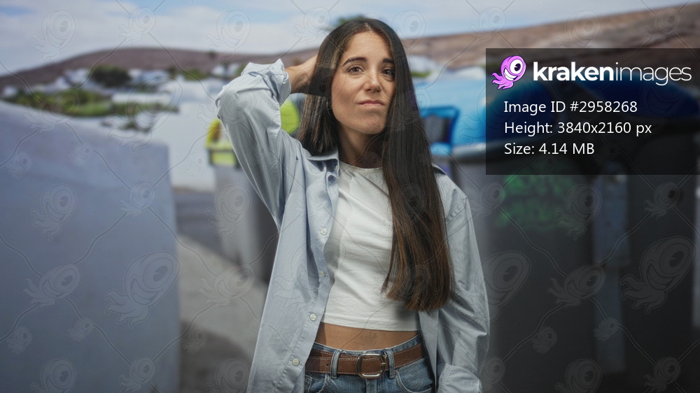 Young woman with hand to head beside blue recycling bin on street wearing white crop top and jeans; pensive reflection.