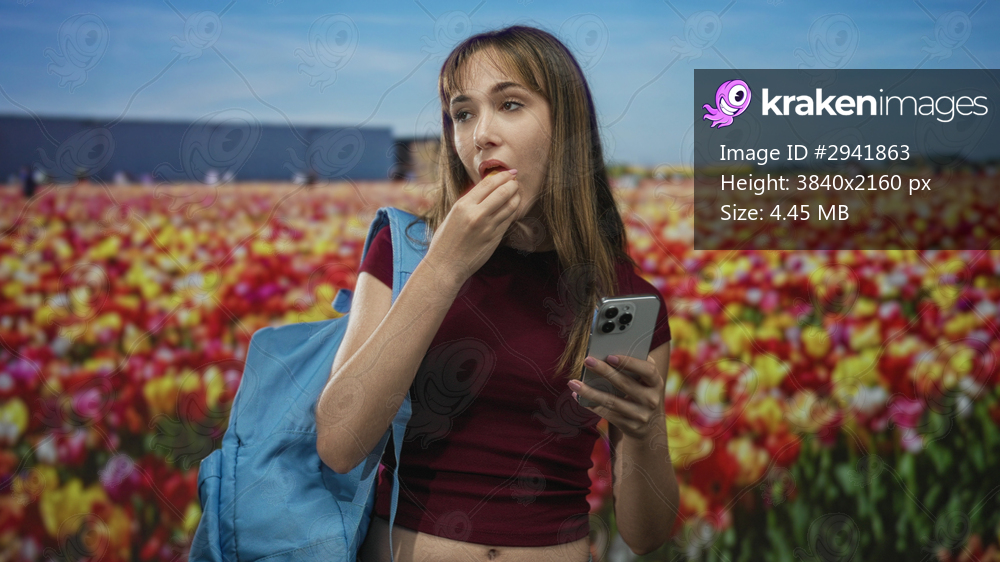 Young woman hand to mouth eating a snack while holding a smartphone and backpack in a colorful tulip field; contentment youth.