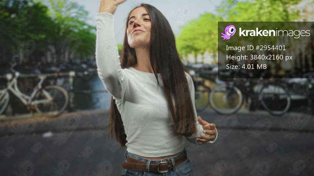 Young woman with hand to nose and expressive gesture on a street by a canal lined with bicycles; playful curiosity.