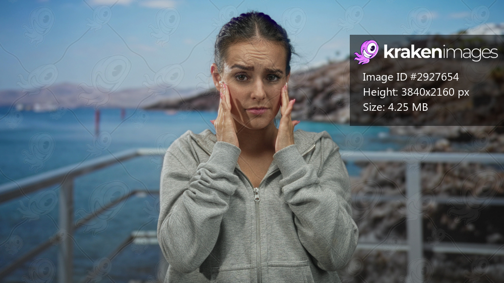 Young woman with hands on cheeks showing toothache by a seaside railing on a beach pier; health discomfort.
