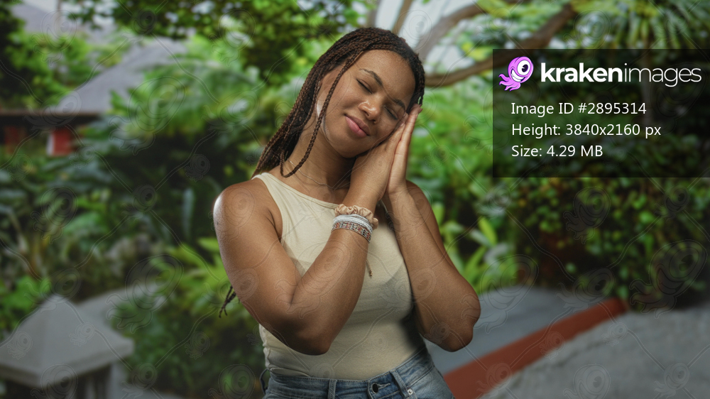 Young woman with hands pressed to cheek and eyes closed on a forest path near green foliage; serenity rest.