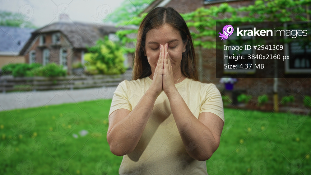 Young woman with hands pressed together, eyes closed, standing at a house entrance on a green lawn; serenity.