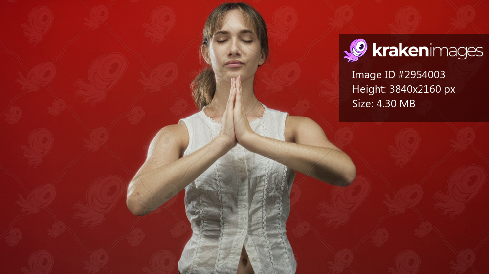 Young woman with hands pressed together in prayer gesture, eyes closed, wearing white sleeveless blouse in red studio; calm reflection.