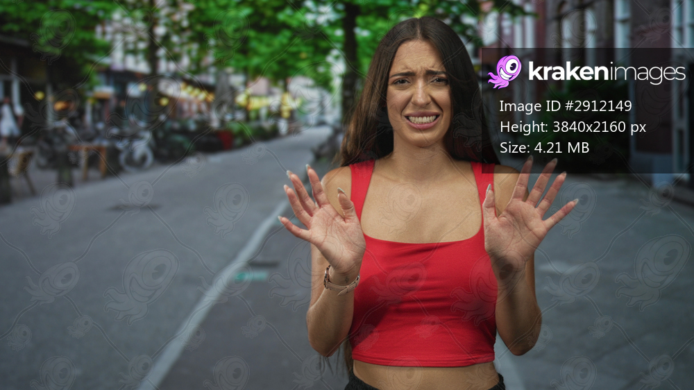 Young woman with hands raised palms out on a city street, red crop top showing midriff and a worried grimace; refusal discomfort.