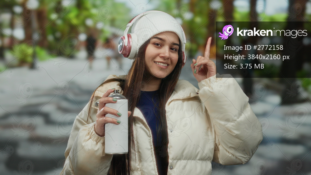 Young woman with headphones holds spray can outdoors on street filled with graffiti and greenery, portraying artistic expression and urban culture.