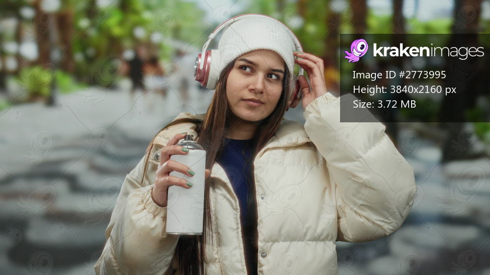 Young woman with headphones holds spray can outdoors on street filled with graffiti and greenery, portraying artistic expression and urban culture.