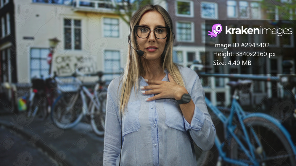 Young woman with headset and glasses adjusting hair on street by amsterdam canal with blue bicycle and canal side buildings; service calm focus.